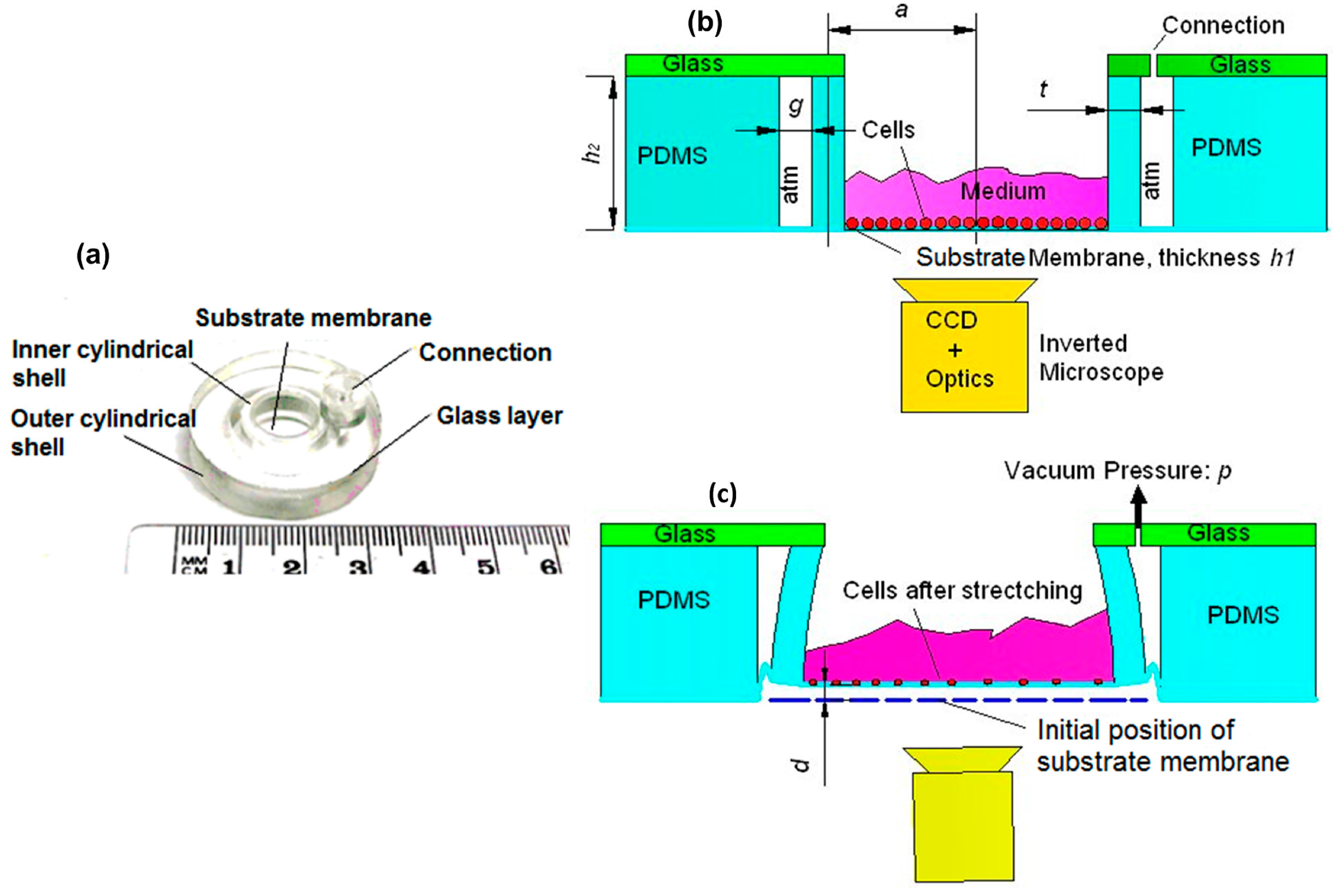 Recent studies of cardiac mechanobiology have shown that to a certain extent mechanical stimulation enhances the growth of stem-cell-derived cardiomyocytes in vitro [1,2,3,4,5,6,7,8]. Thus, different types of devices have emerged for the purpose of mechanical stimulation for stem cells, such as devices that use out-of-plane circular substrate distension, in-plane substrate stretching, or fluid shear stress (FSS) [7,9,10]. Specifically, for example, Bottlang et al. [11] designed a four-point bending system to deliver low strain to cells (about 3000 με), which was driven by shielded electromagnetic actuators. The most widely used commercial device (Flexcell: FX-4000, Flexcell International Corp, Hillsborough, NC, USA) utilized pneumatic pressure to stretch the soft substrate so as to apply the tensile strain in cells [12]. Different from FX-4000, another differential pressure flexible-substrate system that was driven by positive pressure was introduced by Winston et al. [13]. The mechanical strain in this device was achieved by out-of-plane distension of the substrate membrane. Wang et al. developed a cell-stretching device, which employed vacuum pressure to achieve either equiaxial or uniaxial strain field in the substrate membrane [8]. In a recent study, the authors of the present paper developed a pneumatically actuated device with concentric double-shell structure for cell stretching and demonstrated the applicability of the developed stretching device for differentiation of human pluripotent stem cells into cardiomyocytes in long-term cell experiments [6]. The device utilizes vacuum pressure to achieve an equally distributed in-plane strain in a substrate membrane. However, the application of this device is not only focused on cardiacmyocytes, but also any mechanosensitive cells, such as osteoblasts, osteocytes, chondrocytes. In different applications, the thresholds of mechanical strain for enhancing specific differentiations are different. For instance, Gopalan et al. found that the cardiac differentiation was enhanced under the stretching strain of 10% [14], while a mechanical strain of 5% is considered as a threshold for eliciting the osteogenic differentiation [15,16]. However, no mathematical basis has existed to quantitatively determine the applied loading so as to achieve a needed strain in specific cell culture experiment. Furthermore, for example, the cellular morphology and cytoskeleton distribution will be changed during differentiation, and therefore they are important parameters to study. As they can be studied by imaging, the out-of-plane displacement of the substrate membrane influences the imaging capability and thus, the capability of evaluating the cell responses. Moreover, the in-plane strain and out-of-plane displacement of the substrate membrane are intrinsically coupled. In different applications, different in-plane strains may be needed, which will result in different out-of-plane displacement. In some cases, the out-of-plane becomes too large for the CCD camera (Sony XCD-U100, Sony, Barrington, NJ, USA) to clearly detect the cells, and therefore the structure needs to be modified. However, to date, no structural models of this type of devices have been reported.