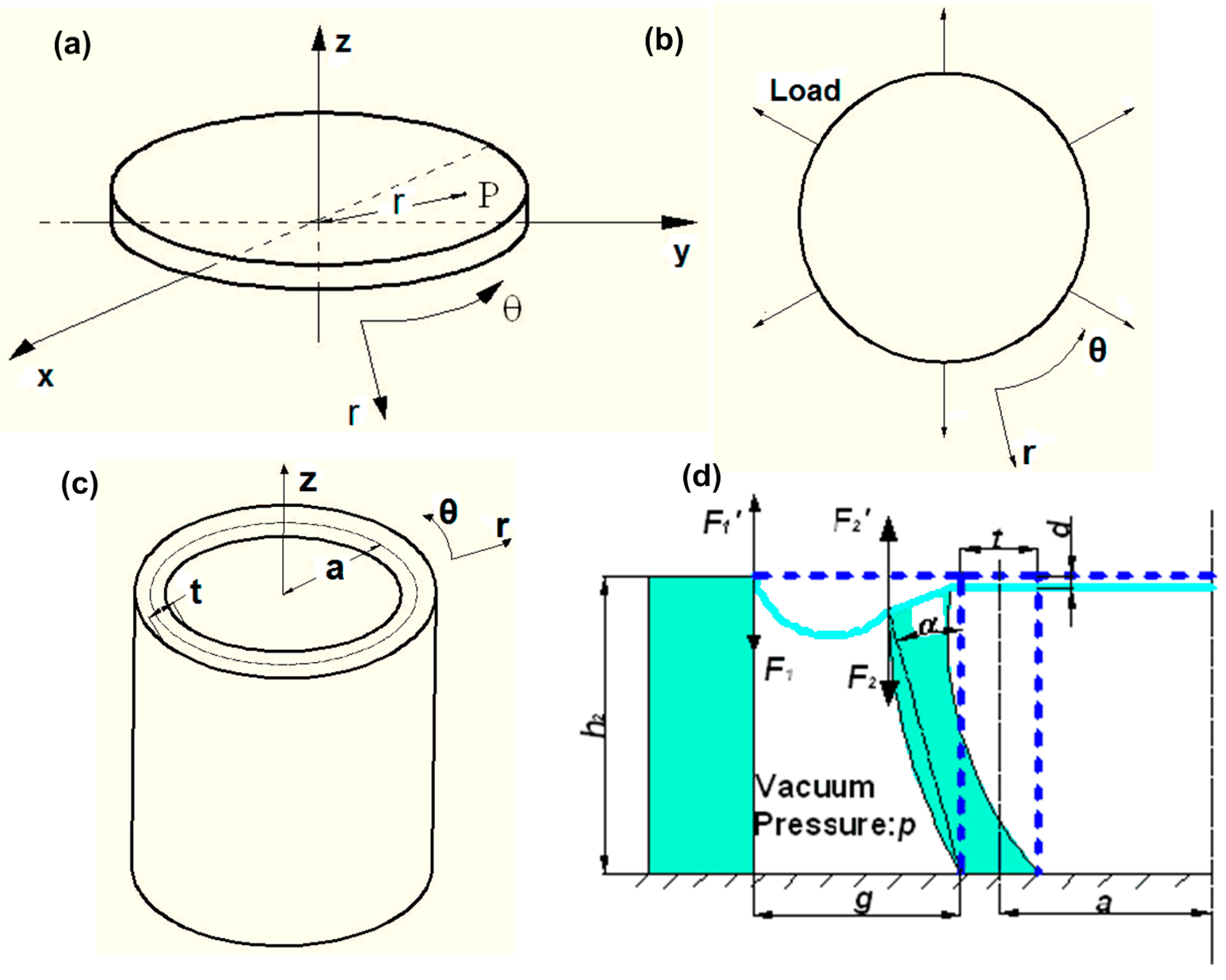 where, p was the vacuum pressure; A1 was the cross-sectional area of the space, where the vacuum pressure was applied; A1 = π[(a + g + t/2)2 − (a + t/2)2]; and g was the gap width, as shown in Figure 2d.