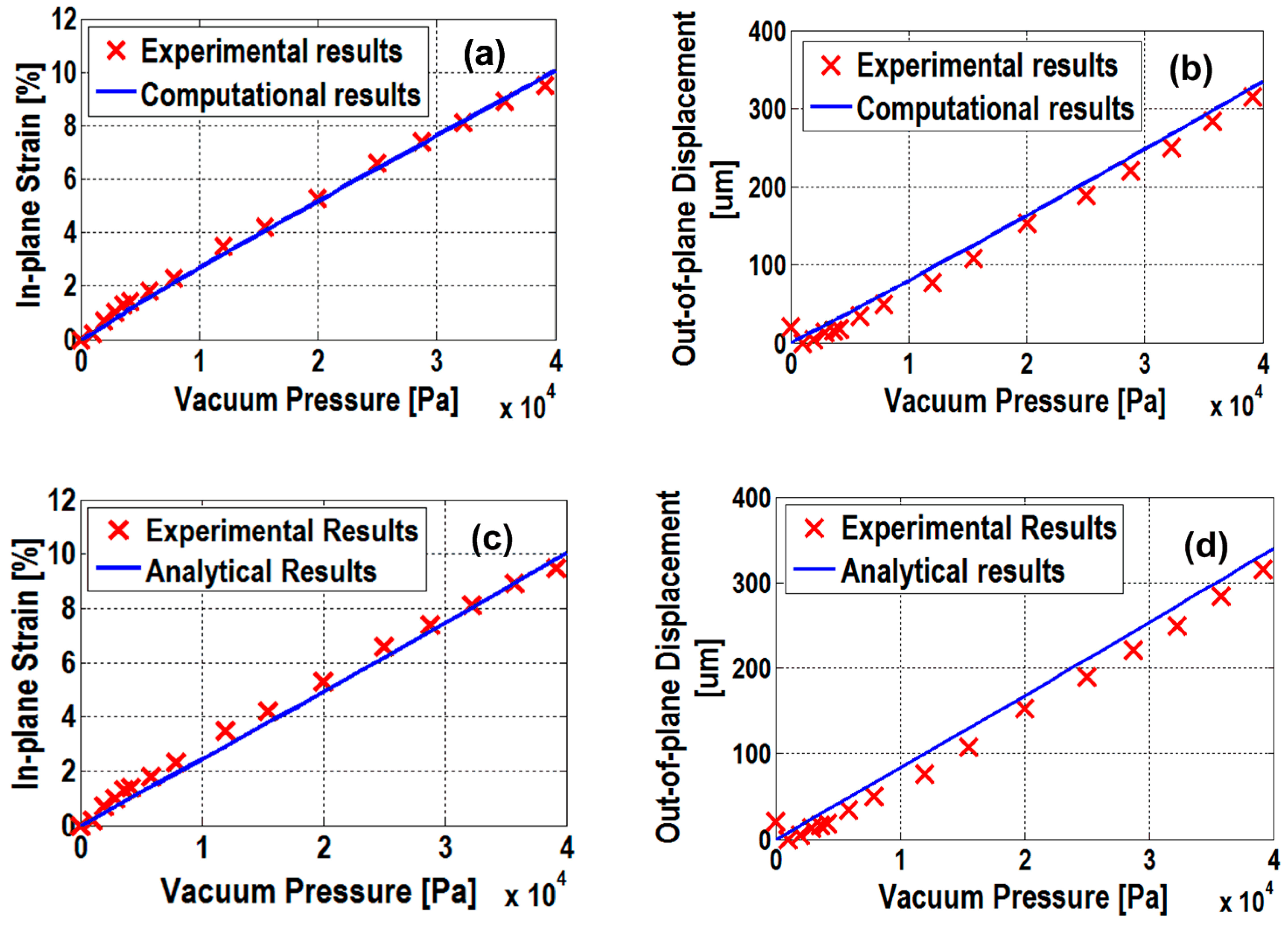 Computational vs. experimental results on (a) in-plane strain and (b) out-of-plane displacement. Analytical vs. experimental results on (c) in-plane strain and (d) out-of-plane displacement.
