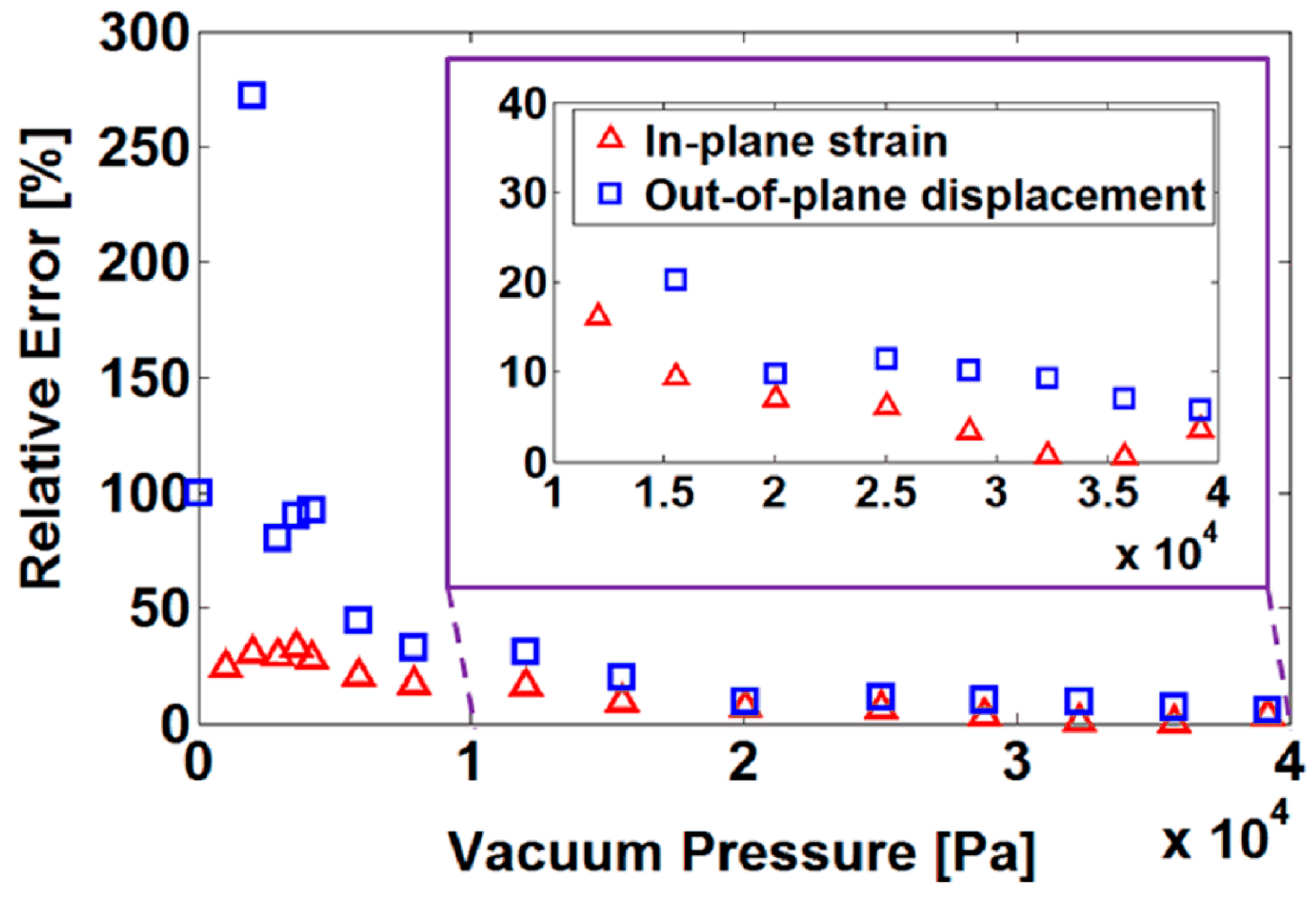 The in-plane strain and the out-of-plane displacement were measured in five locations on the membrane using computer vision similar to the method in [6]. In the measurements, 16 static partial vacuum pressures between 0 and 392 mbar were applied. After each pressure supply step, motorized optics (12× motorized zoom with 3-mm motorized fine focusing, Navitar, Inc., Rochester, NY, USA) were used for focusing on the membrane surface and a camera (Sony XCD-U100) for recording an image. The in-plane strain of the membrane was determined using three manually selected landmark points in each five locations. The (x,y) pixel coordinates of the centroids of the landmarks were recorded and the strain vectors between each pair of them were calculated for each pressure. The out-of-plane displacement was estimated from the displacement of the motorized focusing system.