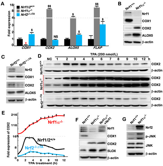 Differential or opposing roles of Nrf1α and Nrf2 in regulating COX2 and COX1 genes. (A) The mRNA levels of COX1, COX2, ALOX5, and FLAP were determined by real-time qPCR in Nrf1/2+/+, Nrf1α−/− and Nrf2−/−ΔTA cells. The data are shown as mean ± SEM (n = 3 × 3, * p < 0.01; $, p < 0.01; $$, p < 0.001). (B) The protein levels of COX1, COX2, ALOX5, Nrf1, and β-actin (as a loading control) in Nrf1α−/− and Nrf1/2+/+ cells were visualized by Western blotting. (C) Western blotting of Nrf1α−/− and Nrf2−/−ΔTA cells to determine protein levels of COX1, COX2, ALOX5, Nrf1, and β-actin. (D) Time-course analysis of COX2 in Nrf1/2+/+, Nrf1α−/− and Nrf2−/−ΔTA cells, that had been treated for 1 h to 12 h with 100 nM TPA (12-O-tetradecanoyl phorbol-13-acetate), before being examined by Western blotting. (E) The intensity of the above anti-COX2 immunoblots (D) was quantified by normalizing the untreated value, which is shown graphically. The data are shown as mean ± SEM (n = 3, * p < 0.01; $, p < 0.01). (F) After the restoration of Nrf1 into Nrf1α−/− cells by packaging with the Lentivirus, changed abundances of Nrf1, COX1, COX2, and ALOX5 among Nrf1/2+/+, Nrf1α−/− and Nrf1α−/−+Nrf1-restored cell lines were examined by Western blotting. (G) Differences in Nrf2, p-JNK and JNK expression between Nrf1/2+/+ and Nrf1α−/− cells were unraveled by Western blotting. (H) The changes in p-JNK, Nrf2 and COX2 were examined, following 24 h treatment of Nrf1α−/− cells with 20 μM of SP600125. (I) Alterations in Nrf2, COX2, Fra1, and Jun by siRNA interference with Nrf2 in Nrf1α−/− cells were determined by Western blotting. (J) The human COX2 promoter-driven reporter PCOX2-luc and its mutant (upper) were constructed before the luciferase assay. Nrf1/2+/+ cells were co-transfected with either PCOX2-luc or mutant, together with an internal control reporter pRL-TK, plus an expression construct for Nrf1 or Nrf2, or empty pcDNA3 plasmid, and allowed for 24-h recovery before the PCOX2-luc activity was calculated (lower). The data are shown as mean ± SEM (n = 3 × 3, * p < 0.01; $, p < 0.01 compared to the pcDNA3 values). (K) Each of PCOX2-luc, its mutant PCOX2m-luc and the empty vector pGL3 was co-transfected with the control reporter pRL-TK, along with siNrf2 or siNC (as a negative control), into Nrf1α−/− cells as described above. The cells were allowed for 24 h recovery from transfection before the luciferase activity was measured. The fold changes in the Nrf2 -mediated activity were calculated as mean ± SEM (n = 3 × 3, * p < 0.01, compared to controls).
