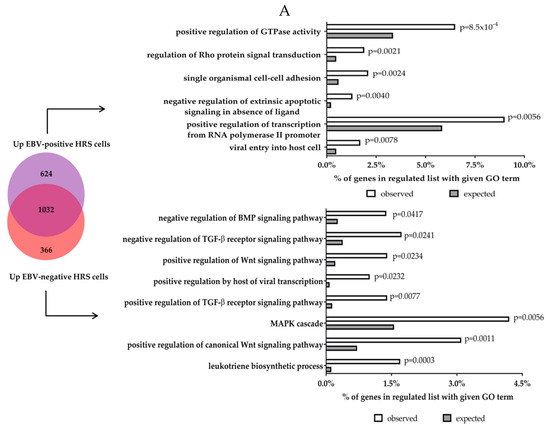 Gene ontology (GO) analysis of genes upregulated (A) and downregulated (B) in either EBV-positive or EBV-negative HRS cells. Gene lists were derived from our reanalysis of genes differentially expressed in either EBV-positive or EBV-negative HRS cells compared to microdissected normal GC. Gene set enrichement was performed using DAVID 6.8 (Frederick, MD, USA) [99,100].