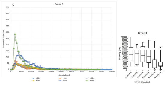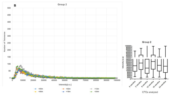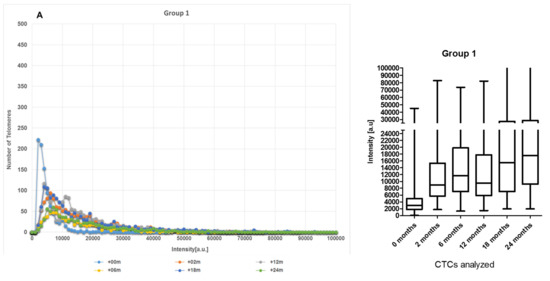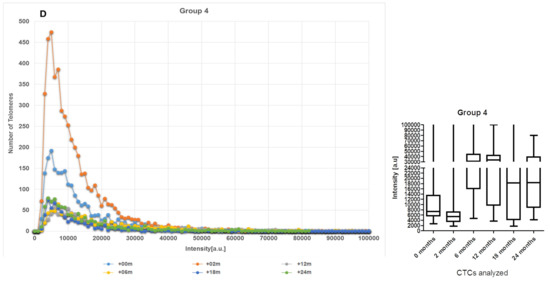Cancer cells commonly exhibit genomic instability with the telomeres often being shorter than those in normal cells [27,30,31]. Based on the dynamics of the 3D telomere architecture of their CTCs (changes in number of short telomeres over time) at +0, +2, +6, +12, +18 and +24 months, patients were classified into five groups. In Figure 3, telomere length (signal intensity, x-axis) is plotted against the number of telomeres (y-axis) for all CTCs analyzed at each time point. Signals are grouped by their intensity level and this gives a picture of the CTCs telomere distribution in each sample or time point. In Figure 3A, at +0 month, approximately 220 telomeres have the same intensity, less than 10,000 a.u (arbitrary units of relative fluorescence intensity), which is of relatively low intensity and can be correlated with short telomeres. For normal lymphocytes, for example, this plot usually has small peaks between 0 and 20,000 a. u, in which the number of telomeres per nucleus on the y-axis ranges between 5 and 25 [16] and most of the telomere signals have high relative intensities, with signals detected up to 120,000 a.u [16].