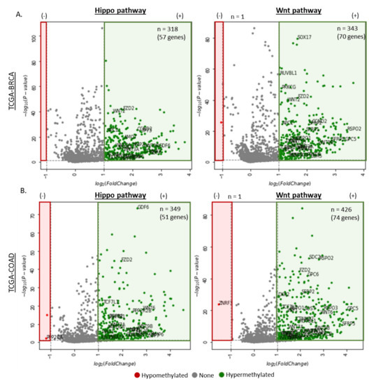 The Hippo and Wnt signaling pathways play a crucial role in maintaining tissue homeostasis and organ size by orchestrating cell proliferation, differentiation, and apoptosis. These pathways are highly complex and have been frequently found to be dysregulated in human cancers. The Hippo pathway consists of a large network of proteins that controls the growth of different tissue during development and growth, as well as in different diseases such as cancer [102], while the Wnt (wingless-related integration site) signaling pathway orchestrates various biological processes, such as cell proliferation, differentiation, organogenesis, tissue regeneration, and tumorigenesis [103,104,105,106,107]. The importance of the Hippo and Wnt pathway in human cancers was first demonstrated when the human tumor suppressor adenomatous polyposis coli (APC) protein was found in association with β-catenin. In these studies, it was found that the APC protein is mutated and inactivated in colorectal cancers, typically in the early stages of cancer development [108]. Methylation analysis of genes associated with either the Hippo or Wnt pathway revealed hypermethylation of a wide range of genes that are shared between the two pathways across the four cancers screened (Figure 3A–D). This cross-talk between the Hippo and Wnt signaling pathways has been explored in a number of studies, and the hypermethylation of these common genes between the two pathways may provide novel therapeutic targets for cancer treatment.