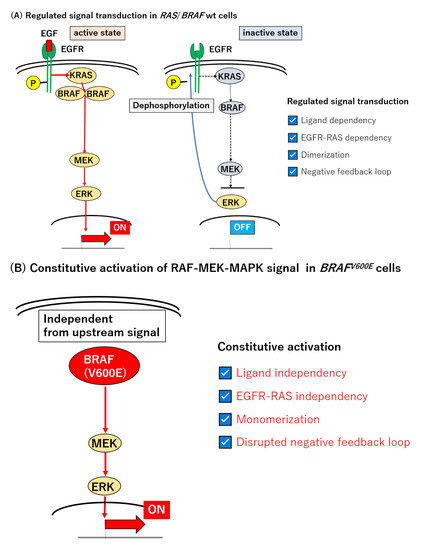 The MAPK signal transduction pathway, including RAS and BRAF, is normally regulated through several levels of feedback loops involving activated, phosphorylated ERK (pERK) [135,136,137,138,139,140,141,142]. Epidermal growth factor (EGF) binds to its specific receptor (EGFR) and initiates the signal transduction of this pathway. Activated RAS induces the dimerization of RAFs which are capable of phosphorylating downstream effectors, MEK and ERK [143,144,145,146]. The resulting pERK stimulates a subset of gene expression, but also inactivates EGFR and attenuates this signal transduction pathway [8,9] (Figure 1A). By contrast, in BRAFV600E-mutated tumors, the MEK–ERK axis is constitutively active, in a manner independent of the RAS-mediated dimerization of RAF [9,144], and is thereby refractory to the negative feedback circuit in this type of tumor (Figure 1B).