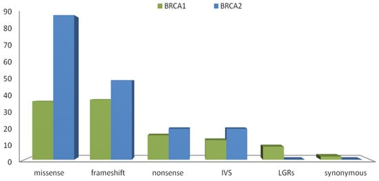 In detail, we observed the following variant types: frameshift (n = 37), missense (n = 36), nonsense (n = 15), intronic sequencing variants (n = 12), synonymous variants (n = 2) and large genomic rearrangements (n = 8) in BRCA1. Regarding the BRCA2 gene, the variants identified were frameshift (n = 49), missense (n = 89), nonsense (n = 19), and intronic sequencing variants (n = 19) variants. Furthermore, no synonymous variations and no large genomic rearrangements in BRCA2 (Figure 1) were detected. For both genes, most of the variants were classified as of Class 5 (67% in BRCA1, 47% in BRCA2). In addition, Class 3 (VUS) were 15% and 30% for BRCA1 and BRCA2, respectively, while the remaining ones were classified, according to the reference database, such as conflict of pathogenicity (15% and 16% for BRCA1 and BRCA2, respectively).