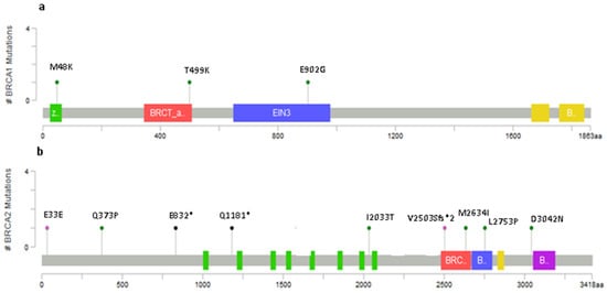 Lollipop plots showing the distribution of novel BRCA1 variants (a) and BRCA2 (b) identified in our patients’ group. The plots were obtained by the informatic tool Mutation Mapper—cBioPortal for Cancer Genomics (GenBank Reference BRCA1: NM_007300 and GenBank Reference BRCA2: NM_000059).