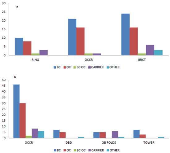 Next to the classic BRCA1 and BRCA2 cluster regions (OCCRs), Rebbeck et al. [] described other cluster “putative BCCR regions” (BCCRP) in which it was observed a relative increase in breast cancer risk while a relative decrease in ovarian cancer risk for variants occurring in these and “putative OCCR regions” (OCCRP), with statistically significant evidence for a relatively higher ovarian cancer versus breast cancer risk for carriers of variant in these (Figure 4a,b).