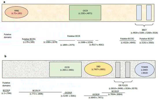 BRCA1 and BRCA2 cluster regions: (a) the classic regions of the BRCA1 gene are shown within the rectangle, while the putative domains, identified by black lines, immediately below. The different putative regions are identified by black lines; (b) the classic regions of the BRCA2 gene are shown within the rectangle, while the putative domains, identified by black lines, immediately below.