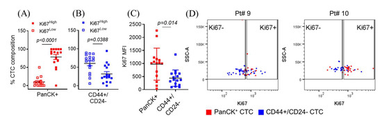 CellSearchTM, the only FDA-cleared platform for clinical CTC testing, captures breast cancer CTCs based on the combination of EpCAM+ and cytokeratin+ (epithelial origin), and CD45− (for leukocyte depletion) biomarkers, leading to exclusion of non-epithelial or stem-like CTCs [17]. CellCollector®, the CE and CFDA-cleared platform, also isolates CTCs based upon EpCAM expression [18]. Additionally, there are multiple technologies in various stages of development to isolate and interrogate disparate CTCs [19]. We consider the use of multi-parametric flow cytometry a rigorous and reproducible approach [14,20] that allows evaluation and capture of the entire spectrum of CTCs and/or abnormal mononuclear cells. We have previously reported that a FACS-based workflow employing the depletion of multiple normal cell lineages (CD45, CD73, CD34, CD105, CD90), along with the positive selection for both epithelial (PanCK+), as well as stem-like (CD44+/CD24−) CTCs, capturing 2–8 fold higher number of stem-like CTCs than epithelial CTCs [21]. Multiple studies have demonstrated that the presence of epithelial CTCs correlate with worse prognosis of metastatic breast cancer, but the role/s of stem-like CTCs remain relatively unknown. Therefore, flow cytometric analyses were performed to determine whether a correlation exists between CTC surface phenotypic markers (epithelial vs stem-like) and the underlying mitotic state in 16 mBC patients. We found that ~83% of epithelial (PanCK+) CTCs were Ki67High while only 32% of stem-like (CD44+/CD24−) CTCs were Ki-67High (Figure 2A–D, and Figure S1). Interestingly, 88% of CTCs were of the stem-like phenotype (Figure S2A,B). Of this, 61% (53% of the total CTC population) were Ki67Low (Figure 2B). We also checked the combinatorial expression patterns of uPAR and integrin-β1 (int-β1), two established biomarkers of CTC dormancy and metastatic competence [21,22,23]. When measured individually, uPAR expression was significantly higher in epithelial CTCs (Figure 2G), while int-β1 expression was similar between epithelial vs stem-like CTCs (Figure S2C). However, upon combining the two biomarkers to identify uPAR+/int-β1+ vs uPAR−/int-β1− CTC groups (Figure 2H and Figure S1), we did not find a significant difference in the proportion of stem-like and epithelial CTCs in these two groups (Figure 2E,F). Combined, these data indicate that the majority of CTCs found in metastatic breast cancer patients maintain a stem-like (CD44+/CD24−) state, while staying mitotically inactive; whereas a smaller sub-population of CTCs are of an epithelial (PanCK+) phenotype, with a higher proliferative index. We built upon these data to determine what molecular pathways may be involved in the switch between quiescence and proliferation, and examined whether the cellular environment plays a role in determining the proliferative status.