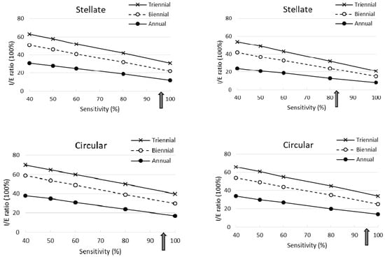 Using the parameters estimated from Figure 2 in the second period (1996–2010), Figure 3a (see the indicated points by arrows; the details of numerical values also see the bottom panel of Table 1) shows the percentages of I/E ratio for the stellate type were 23% and 32% for the biennial and triennial program, respectively. The corresponding figures were 32% and 43% for the circular type and 21% and 29% for powdery and crushed stone-like calcifications. In spite of longer MSTs, the similar findings on the percentage of the I/E ratio were also noted in the first period (Figure 4b).