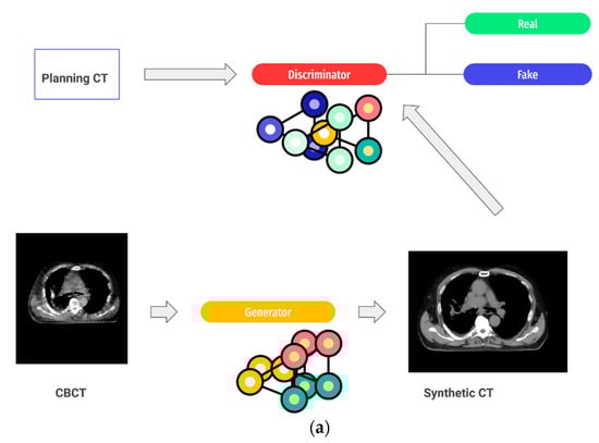 There are mitigation strategies one can consider when preprocessing medical images to increase the robustness of image-derived features: (A) correction of the dependencies of radiomic features on image acquisition settings and (B) investigation of automated methods to manipulate and improve image quality. Examples of the former have been shown in a study by Zhovannik et al., where radiomic features were corrected against changes in exposure values in CT phantom images [], while Ligero et al. developed a post-acquisition CT image-correction method for radiomic features based on the ComBat method, which is borrowed from genomic studies []. A ComBat approach could work for handcrafted radiomic features but may prove challenging for neural network approaches, since ComBat bypasses, a priori, a definition of relevant imaging features to be extracted. The latter method (often referred to as domain adaptation and synthetic imaging) involves the application of advanced DL algorithms, often using generative adversarial networks (GANs). GANs are a framework that optimizes an objective by running the zero sum of a two-player game between two networks. One of the networks, called the generator, tries to learn the data distribution by trying to fool the other network, called the discriminator, which simultaneously tries to differentiate between real images and fake images created by the generator []. In a domain adaptation approach, the real image may be a CT scan acquired by a certain scanner manufacturer (domain, real image) that will be translated into a corresponding CT scan as acquired within another institution (target, fake image). In a synthetic imaging approach, the network could try to generate synthetic CTs from CBCTs. Figure 2a depicts an example of the latter, while Figure 2b shows how this workflow can be integrated within the current adaptive radiotherapy workflow. GANs’ applications in radiation oncology are becoming very popular and showing early promising results. For example, using GANs for domain translation improved the auto-contouring of pulmonary nodules when using imaging data from multiple institutions.