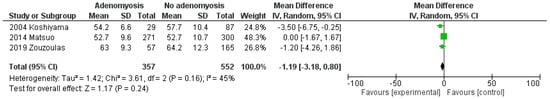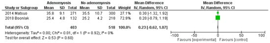 Pooled mean difference in mean ± SD between EC women with and without adenomyosis was −1.19 (95% CI: −3.18 to 0.80; p = 0.24; I2 = 45%) for age (Figure 1), and 0.23 (95% CI: −0.62 to 1.07; p = 0.60; I2 = 0%) for BMI (Figure 2).