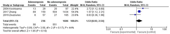 For dichotomous variables (premenopausal status and nulliparity), the odds ratio (OR) between EC patients with and without adenomyosis was calculated for each included study and as a pooled estimate, and graphically reported on forest plots with 95% CI.