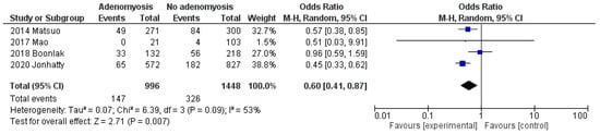 When compared to EC women without adenomyosis, EC women with adenomyosis showed a pooled OR of 1.53 (95% CI: 0.92 to 2.54; p = 0.10; I2 = 44%) for premenopausal status (Figure 3), and of 0.60 (95% CI: 0.41 to 0.87; p = 0.007; I2 = 53%) for nulliparity (Figure 4).
