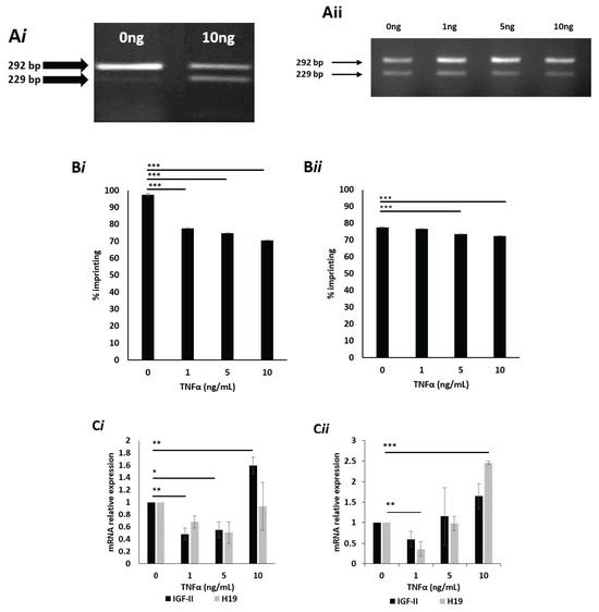To assess the effects of TNFα upon imprinting percentage, pyrosequencing was used. Cells cultured in 5 mM glucose (Figure 2Bi) and dosed with 1, 5 and 10 ng/mL all showed significant (p < 0.001) decreases in imprinting percentage, compared to controls. Cells cultured in 25 mM glucose (Figure 2Bii) and dosed with 5 and 10 ng/mL TNFα both showed highly significant decreases in imprinting percentage (p < 0.001 and 0.001, respectively) when compared to controls.