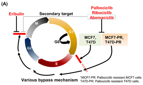 Various mechanisms of resistance to CDK4/6 inhibitors have been previously explored [5]. In addition to RB loss and cyclin E overexpression, which were clinically confirmed mechanisms of resistance to CDK4/6 inhibitors in the literature [6,7,8], other various bypass signaling pathways associated with resistance mechanisms (e.g., activation of CDK2-cyclin E signaling [9] and growth signaling pathways) are also studied [10,11]. Those bypass signaling pathways, helping cells progress to the G2/M phase, losing their dependency on cyclin D-CDK4/6 signaling [5,9]. Thus, targeting the G2/M cell cycle phase could be a rational approach to inhibit the cells that pass the G1/S phase. Therefore, new effective combination therapy was tried by combining Food and Drug Administration (FDA)-approved anticancer drugs in palbociclib failure.