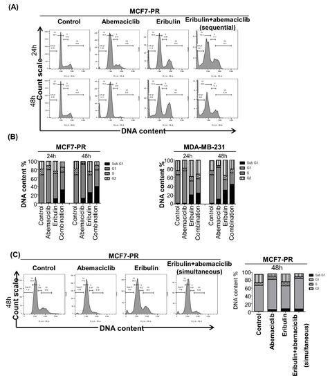 The current study next examined the effect of combination treatment on the cell cycle to elucidate the synergistic mechanism of eribulin plus abemaciclib in breast cancer cells. Eribulin is known to induce G2/M arrest [28], while abemaciclib induces G1 arrest in cancer cells [29]. Palbociclib-resistant cells, MCF7-PR, were treated with eribulin with or without abemaciclib quarter-maximal inhibitory concentration (IC25) concentrations for 48 h, and cell cycle was analyzed by flow cytometry. As expected, cells were arrested at the G2/M and G1 phases after treatment with eribulin and abemaciclib as a single agent, respectively. Notably, eribulin combined with abemaciclib treatment dramatically induced the sub-G1 phase, indicating synergistic cytotoxic activity (Figure 3A). In addition, we observed higher higher G2/M arrest at 12 h time point compared to 24 h and 48 h denoting prolonged G2/M arrest occurs early time point and this eventually triggers cell death by apoptosis (Figure S3A). Intriguingly, palbociclib-sensitive HR-positive cells (MCF7) and TNBC cells (MDA-MB-231) also showed a similar pattern (Figure 3B and Figure S3A,B). However, unlikely the sequential treatment of both drugs, simultaneous treatment fashion could not induce the sub-G1 in the cell cycle analysis (Figure 3C). This result indicated antagonistic activity between eribulin and abemaciclib by simultaneous treatment with both drugs. To further investigate whether the synergism of sequential eribulin and abemaciclib treatment was due to apoptosis, the current study performed annexin V/propidium iodide (PI) staining and found a significant increase in both early and late apoptosis rate in both palbociclib-resistant and sensitive cells and TNBC cells (Figure 3D,E and Figure S3C).
