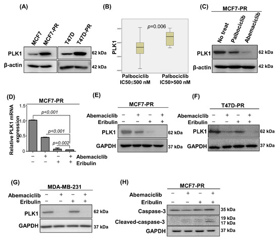 The pole-like kinase 1 (PLK1) is a protein kinase that regulates the cell cycle during mitotic entry and the G2/M checkpoint [30,31]. Considering the multiple PLK1 functions in the G2/M phase, the current study next examined the association of PLK1 expression and palbociclib resistance, which was not previously well-studied [32]. The current study remarkably noticed the PLK1 overexpression on MCF7-PR and T47D-PR cells compared with their parental counterparts (Figure 4A). The TNBC cell line, MDA-MB-231 cells, also showed PLK1 overexpression compared with palbociclib-sensitive cells, MCF7 and T47D (Figure S4A). Furthermore, when analyzing the association of palbociclib activity and PLK1 mRNA expression in 38 breast cancer cell lines using Cancer Cell Line Encyclopedia (CCLE) data, the current study found that cells with low palbociclib activity (IC50 > 500 nM) had higher PLK1 expression (p = 0.006; Figure 4B). MCF7-PR cells treated with IC50 concentrations of palbocilib or abemaciclib had a higher PLK1 inhibition with abemaciclib than palbociclib treatment (Figure 4C), indicating the enhanced activity of abemaciclib in the G2/M phase. The current study then performed quantitative real-time polymerase chain reaction (qRT-PCR) and western blot analyses to detect the PLK1 changes after the sequential eribulin and abemaciclib treatment in palbociclib-resistant cells. The current study demonstrated that the mRNA and PLK1 protein levels decreased in the combination treatment cells compared with the eribulin or abemaciclib treatment alone or with no treatment control cells (Figure 4D–G). In addition, the downstream kinases of PLK1, were also inhibited by the combined treatment of eribulin and abemaciclib. (Figure S4D). Cleaved caspase-3 increased in the combination treatment cells compared with the monotherapy or no treatment cells, which implies that combination treatment enhances apoptosis (Figure 4H). This synergistic mechanism occurred in the palbociclib-resistant and TNBC cells as well as palbociclib-sensitive cells (Figure S4B,C).