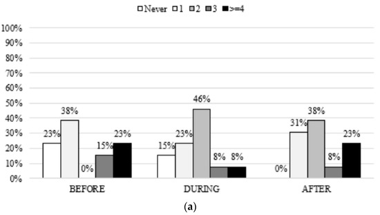 The most common exercise preferences before and during treatment were at a frequency of one to two times/week, 15–30 min/bout at a light intensity. After treatment, patients reported an absolute increase in training frequency, duration, and intensity (most people were willing to participate in an ET program more than two times/week, at moderate intensity and 38.5% for more than 30 min (Figure 3)).