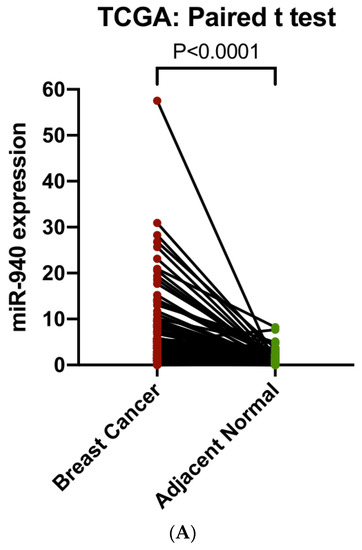 Analysis of hsa-miR-940 expression in breast cancer and adjacent normal breast tissues (n = 105), as well as its expression in association with overall survival in TCGA. (A) Comparison of hsa-miR-940 expression between breast cancer and match adjacent normal tissues (n = 105). (B) Kaplan–Meier overall survival (OS) curves by high, mid, and low expression of hsa-miR-940.