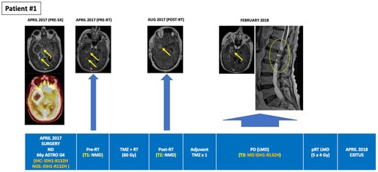 Tumour evolution in BEAMing ctDNA-positive patient #9. A 58-year-old woman was diagnosed in 2004 of a grade II oligodendrogliomas undergoing a gross total resection. In 2011 the tumor relapsed, undergoing a subtotal resection with aphasia as a postsurgical sequel. The patient then received adjuvant TMZ for 12 cycles. RT was disregarded due to the potential sequelae given the large volume to irradiate. In July 2017, the patient suffered an unresectable relapse. NGS analysis of the 2011 archived tumor sample unveiled two co-existing mutations in IDH1 (R132H and R132C). RT (54 Gy in 30 fractions) was administered between August and October 2017. BEAMing plasma ctDNA analysis did not detect any mutation prior to RT. After RT the patient received adjuvant TMZ for 6 cycles. Partial response was observed after RT, but progressive disease occurred in the antero-medial surgical cavity margin from May 2018 until January 2020, when the patient was lost to follow up. In May 2018, after finishing adjuvant TMZ, BEAMing plasma ctDNA analysis detected one of the IDH1 mutations detected in the tumor resected in 2011 (ctDNA IDH1-R132C VAF 0.025%, which is above de LOD for BEAMing (>0.02%)). However, ctDNA analysis performed in November 2018 did not detect any mutation. BEAMing: Beads, Emulsion, Amplification and Magnetics, ctDNA: circulating tumor DNA, F-U: follow-up, IDH1: isocitrate dehydrogenase type 1, IHC: immunohistochemistry, LMD: leptomeningeal disease, LOD: limit of detection, MUT: mutant, NGS: next-generation sequencing, NMD: no mutation detected, pRT: palliative radiotherapy, RT: radiotherapy, SX: surgery, TMZ: temozolomide, Unmet: unmethylated, VAF: variant allele frequency.