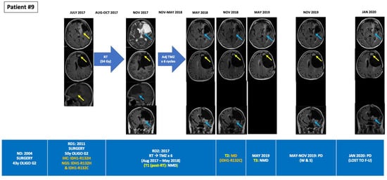 - Tejera, D.; Kushnirsky, M.; Gultekin, S.H.; Lu, M.; Steelman, L.; de la Fuente, M.I. Ivosidenib, an IDH1 inhibitor, in a patient with recurrent, IDH1-mutant glioblastoma: A case report from a Phase I study. CNS Oncol. 2020, 8, CNS62. [Google Scholar] [CrossRef]
