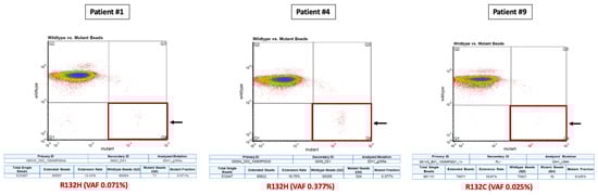 BEAMing ctDNA plots showing the IDH1 mutations detected and their respective VAF Red squares and black arrows indicate the mutant fraction within the BEAMing plot. BEAMing: Beads, Emulsion, Amplification and Magnetics, IDH1: isocitrate dehydrogenase type 1, VAF: variant allele frequency.