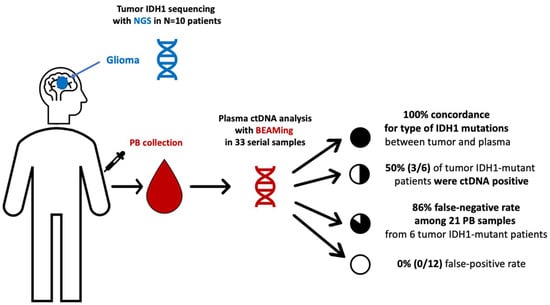 Peripheral blood (PB) samples were prospectively collected at different timepoints of clinical interest in both newly diagnosed and recurrent disease (prior to surgical resection, before and after irradiation and before, during and after chemotherapy) (see the sample collection chronogram in Supplementary Figure S1). PB samples were collected in 10-mL Streck cell-fre DNA BCT tubes (La Vista, NE, USA). PB samples and the corresponding formalin-fixed paraffin-embedded (FFPE) tumor samples were analyzed for IDH1 mutational status using BEAMing digital PCR and next-generation sequencing (NGS). This study was conducted according to the REporting recommendations for tumour MARKer prognostic studies (REMARK) [].