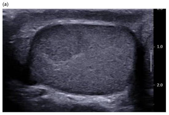 - Isidori, A.M.; Pozza, C.; Gianfrilli, D.; Giannetta, E.; Lemma, A.; Pofi, R.; Barbagallo, F.; Manganaro, L.; Martino, G.; Lombardo, F.; et al. Differential Diagnosis of Nonpalpable Testicular Lesions: Qualitative and Quantitative Contrast-enhanced US of Benign and Malignant Testicular Tumors. Radiology 2014, 273, 606–618. [Google Scholar] [CrossRef] [PubMed]