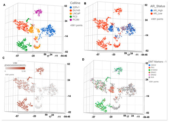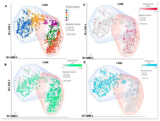Next, we compared the single-cell gene expression markers between taxane-sensitive (DU145) and the clonally derived acquired taxane-resistant mCRPC cell line DUTXR (Figure 2). We observed upregulation of gene signatures association with mesenchymal transition (VIM and TGFB1) and downregulation of the epithelial marker epithelial cadherin/E-cadherin (CDH1) in the DUTXR cell line compared to DU145 (Figure 2B–D). Further, the taxane-resistant DUTXR also showed enrichment of biomarkers that play significant roles in cancer progression, development, and maintenance of cancer stemness (CD44; Figure 2E,F) and drug resistance (CDK1, CXCL8; Figure 2G), indicating probable involvement of these genes in mCRPC development and progression [38].