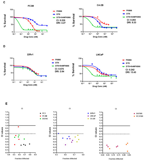 The effect of DTX, CBZ, and FK866 as single-agent administration on mCSPC, mCRPC cells lines, as well as the acquired taxane-resistant mCRPC line DUTXR cells, were assessed by MTT assay at increasing drug concentrations treatment of each drug. In vitro single-agent cytotoxicity assay results are displayed in Figure S1 as dose vs. %survival. FK866 shows time-dependent decreases in cell survival after 48 h of drug treatment in all the PCa cell lines. Furthermore, IC50 values of FK866 were inversely correlated with the IC50 values of taxanes, indicating possible synergy (Spearman r < −0.9; p = 0.0167). Next, we evaluated the effect of increasing concentrations of DTX + FK866 combination treatment on the ARlo mCRPC cell lines PC-3, DU145, the acquired taxane-resistant mCRPC lines DUTXR and PC3-TXR, the clonally-derived metastatic (PC3M), and the AR-independent (C42B) PCa lines, as well as the ARhigh mCSPC lines LnCAP and 22Rv1 (Figure 3A–D). The dose-response curves for the drug combinations and CI values indicated high synergy, which was even more profound (CI between 0.2–0.37) in the TX-resistant lines (Figure 3E). Similar highly synergistic results were observed for the FK866 + CBZ combination treatment as well as the acquired taxane-resistant mCRPC (DU145 resistant-DUTXR) cells (Figure S2).