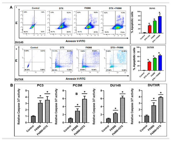 To further determine the synergy of these compounds, we performed the assessment of annexin V (a marker of apoptosis) and PI (a marker of necrosis) using flow cytometry in DU145 and DUTXR cells following exposure to FK866 as a single agent as well as in combination with DTX. Our results in Figure 4A showed significant increases in cells staining positive for annexin V and PI following FK866 and FK866 + DTX treatment compared to control and DTX treatment, confirming significantly higher treatment-induced apoptosis post-FK866-treatment. To confirm whether the loss of cell viability following FK866 treatment was indeed due to apoptosis, schedule-dependent effects of FK866 single-agent and combination treatments were determined by measuring the caspase-3/7 activity at estimated IC50 (Figure 4B). Our results showed that treatment with FK866 and DTX + FK866 induced apoptosis in every cell line compared to the control (no drug treatment) cells. The relative increase (fold change) in caspase-3/7 activity following were 3.09, 2.96, 2.36, and 2.66 for FK866 single-agent treatment and 3.96, 5.94, 6.23, and 4.66 for FK866 + Taxane combination treatment in PC3, PC3M, DU145, and DUTXR, respectively.