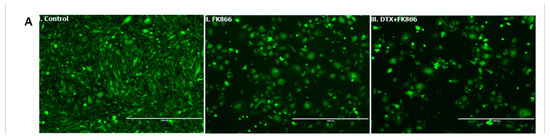 Furthermore, pre- vs. post-FK866 single-agent/combination treatment immunoblotting results of the pro-apoptotic markers cleaved caspase 9 and cleaved caspase 3 corroborated with our caspase 3/7 assay, in addition to the downregulation of the anti-apoptoptic protein Bcl-2 (Figure 4C; original uncropped western blots of Figure 4C are included in the supplementary materials, Figure S8). Interestingly, among all the treatment regimens, the highest level of apoptosis was observed for combination treatment with FK866 + DTX.
