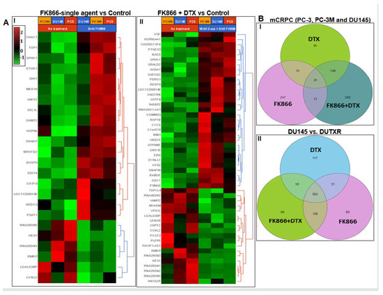 FK866 showed selective on-target inhibition of NAMPT activity. (A) FK866 post-treatment NADH activity: Effect of FK866 on total cellular NAD+/NADH ratio in PCa cell lines was detected by NADH activity assay in ARlo mCRPC (I. PC3, II. PC3M, III. DU145) and in Acquired taxane resistant mCRPC (IV. DUTXR) cell lines treated with FK866 doses equivalent to IC50 and IC50/2 of each cell lines. A significant decrease in the NAD+/NADH ratio was observed compared to control cells after 24 h of treatment. Results are presented as mean ± SD; n = 3 for each experiment (* p < 0.05, compared to untreated controls). (B) Pre- vs. Post-treatment scRNAseq data analysis: Effect of NAMPT inhibitor (FK866) on the sub-clonal population of human prostate cells in vitro following single-cell transcriptomics analysis. I. Pre- vs. post-treatment t-SNE clusters, showing II. Erosion of the PSAT1high cluster (Cluster 5) in the FK866-treated scRNAseq data.