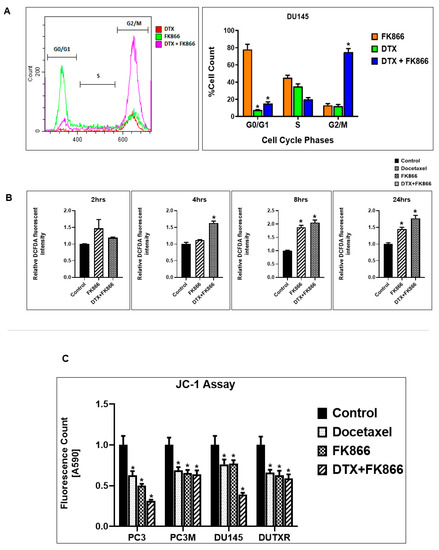 Finally, we also showed that FK866 treatment reduced mCRPC cell density and changed nuclear morphology. Cells were exposed to FK866 treatment as a single agent as well as in combination with DTX, and cellular morphology was assessed using phase-contrast microscopy. In agreement with MTT assays, micrographs of PCa cells exposed to both FK866 and FK866 + DTX dosing regimens showed decreases in cell density compared to control cells, as shown in Figure 5A. Further, assessment of nuclear morphology of attached cells using NucBlue staining, a reagent frequently used to distinguish condensed nuclei in apoptotic cells, suggested FK866-induced morphological changes like nuclear fragmentation and chromatin condensation, which are indicative of apoptosis (Figure 5B). In addition, our results showed even higher cell death and more nuclear damage in FK866 + DTX combination treatment compared to FK866 single drug treatment.
