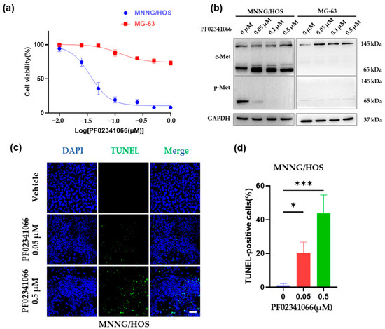 To evaluate the tumor suppressive effect of c-Met inhibition, MNNG/HOS and MG-63 cells were respectively cultured in serum-free medium and treated with various concentrations of the c-Met inhibitor PF02341066 for 48 h. Compared with the control group, the proliferation of MNNG/HOS cells was remarkably reduced after PF02341066 treatment in a dose-dependent manner (IC50 = 0.04 μM, Figure 1a). However, PF02341066 had a weaker inhibitory effect on the proliferation of MG-63 cells (IC50 > 1 μM, Figure 1a). Western blotting analysis showed that after being treated with increasing concentrations of PF02341066, c-Met phosphorylation was completely abrogated (Figure 1b). In addition, a notable pro-apoptotic effect was observed in MNNG/HOS cells after being treated with PF023412066 for 24 h. The TUNEL assay indicated that the number of apoptotic MNNG/HOS cells dramatically increased as the concentration of PF02341066 increased (Figure 1c,d). In contrast, neither 0.05 μM nor 0.5 μM PF02341066 treatment induced apoptosis of MG-63 cells (Figure 1e,f). These results demonstrated that the c-Met inhibitor had a specific cell-killing effect on MNNG/HOS with high phosphorylation of c-Met but displayed an unsatisfactory effect on MG-63 cells with low c-Met phosphorylation. We reasoned that the different responses to c-Met targeted inhibition between cell lines might be caused by the different forms of c-Met activation. PF02341066 is ideal for treating OS patients who are dependent on constitutively activated c-Met signaling.