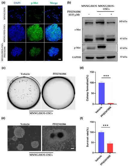 CSCs in OS have been identified as a subpopulation that is associated with drug resistance and recurrence [30]. Based on our previous study, microenvironmental signals could endow adherent OS cells with stemness and promote the formation of OSCs [11]. Immunofluorescence (Figure 2a) and Western blotting analysis (Figure 2b) showed that the MNNG/HOS-OSCs presented elevated levels of c-Met phosphorylation compared with adherent MNNG/HOS cells. PF02341066 treatment efficiently blocked the phosphorylation of c-Met in MNNG/HOS-OSCs (Figure 2a,b). Soft agar colony formation assay demonstrated that MNNG/HOS-OSCs treated with PF02341066 formed less colonies than the DMSO-treated cells (Figure 2c,d). Moreover, PF02341066 treatment significantly reduced cell viability (Figure 2e,f) and promoted the apoptosis of MNNG/HOS-OSCs (Figure 2g,h). Taken together, these results confirmed that c-Met inhibitor effectively inhibited the proliferation and survival of MNNG/HOS-OSCs.