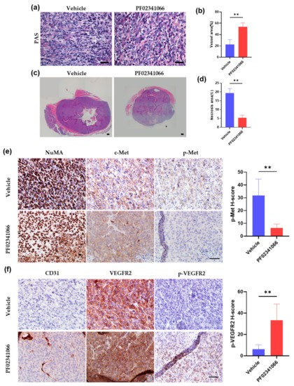 OS is a highly vascularized tumor characterized by abundant microvessels and VM. Patients with lower MVD show a better response to neoadjuvant chemotherapy and a higher survival rate [31]. Interestingly, more vessels (Figure 4a,b) and less necrosis (Figure 4c,d) were detected in xenografts after PF02341066 treatment. Compared to the vehicle group, IHC staining further revealed an obvious downregulation of c-Met phosphorylation accompanied by the activation of VEGFR2 in OS cells adjacent to the vascular microenvironment, which was indicated by CD31-positive staining in the PF02341066 treatment group (Figure 4e,f). Additionally, PAS staining showed that OS cells could form VM. Similarly, OS cells adjacent to VM had less c-Met phosphorylation (Figure 4g) and higher VEGFR2 activation (Figure 4h) than those far from VM. We postulated that drug-sensitive OS cells might escape the PF02341066-induced proliferative inhibition and apoptosis by virtue of the vascular niche.