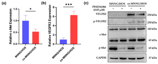 VEGFR2 activation might tie up with the downregulation of c-Met signaling in MNNG/HOS cells. (a–c) qRT-PCR (a,b) and Western blotting (c) analysis on the expression and phosphorylation of c-Met and VEGFR2 in MNNG/HOS cells and co-MNNG/HOS cells after being treated with 0.05 μM PF02341066 for 48 h. Mean ± SEM, three independent experiments, n = 3. *** p < 0.001, * p < 0.05 two-tailed Student’s t-test. (d) Immunofluorescence staining of MNNG/HOS-OSCs and VM revealed c-Met and the phosphorylation of c-Met. Scale bar = 50 µm. (e) IHC analysis on the activation of VEGFR2 in VM. Scale bar = 50 µm. (f) Western blotting analysis on the expression and the phosphorylation of c-Met in MNNG/HOS cells after 50 ng/mL VEGFA induction for 72 h. (g) Representative images of immunoprecipitation revealed a physical interaction between c-Met and VEGFR2. Detailed information about Western blot can be found at supplementary materials.