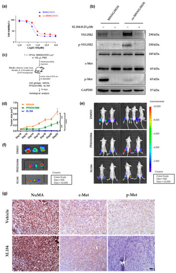 Based on the above in vitro and in vivo observations, we further explored whether dual targeting c-Met and VEGFR2 could exert a lasting cytocidal effect on OS cells. XL184 (cabozantinib) is an ATP-competitive inhibitor of a wide range of kinase receptors that most potently inhibits both c-Met and VEGFR2 receptors [34]. Compared with the vehicle group, the proliferation of MNNG/HOS (IC50 = 0.057 μM) and co-MNNG/HOS (IC50 = 0.077 μM) cells was markedly repressed after XL184 treatment (Figure 6a). Western blotting analysis showed that XL184 treatment significantly inhibited the phosphorylation of c-Met and VEGFR2 in both MNNG/HOS and co-MNNG/HOS (Figure 6b). To investigate the effects of XL184 treatment on MNNG/HOS in vivo, MNNG/HOS cells stably overexpressing luciferase (MNNG/HOS-Luc+) were established for bioluminescence imaging. MNNG/HOS-Luc+ cells were intramuscularly transplanted into BALB/c nude mice. On day 6, a tumor of approximately 0.5 cm diameter formed, and the mice were treated with PF02341066 or XL184 (50 mg/kg), as illustrated in Figure 6c. Treatment with XL184 markedly suppressed the growth of tumors compared to either the vehicle- or PF02341066-treated groups (Figure 6d). The bioluminescence imaging analysis revealed that MNNG/HOS-Luc+ bearing mice treated with XL184 presented minimal signals (Figure 6e,f). This drug showed a higher potency of inhibition that both c-Met and VEGFR2 phosphorylation could be efficiently suppressed with this dual targeting inhibitor treatment than the vehicle group (Figure 6g,h). Furthermore, we performed IHC analysis on xenograft tissues using the cell proliferation-associated marker Ki67 to examine the growth-inhibitory effect of XL184. The Ki67 nuclear expression and intensity in the XL184 group were much lower than those in the other groups, suggesting that XL184 successfully suppressed the proliferation of MNNG/HOS in vivo (Figure 6i). Besides, quantitative analyses on the expression of p-Met, p-VEGFR2 and Ki67 are indicated in Figure 6j–l. In summary, the above results collectively demonstrated that dual targeting c-Met and VEGFR2 could be a promising therapeutic strategy for OS patients in future clinical development.