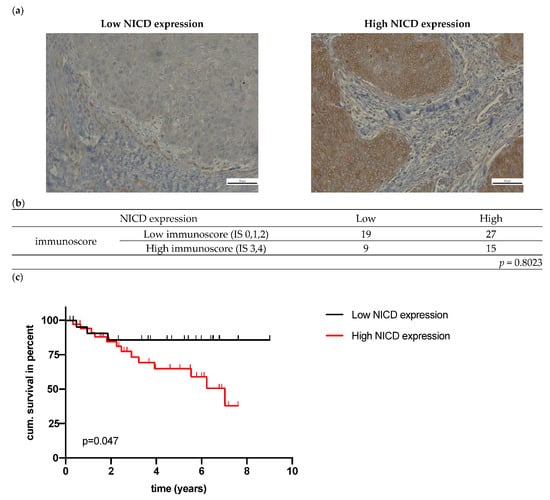 The five-year survival of the 17 patients in the high-risk group was 44.3%, while none of the patients died in the low-risk group (low NICD + high IS). NICD expression was not associated with the infiltration of lymphocytes (p = 0.8023, Figure 2b).