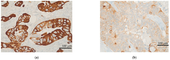 Moreover, IHC demonstrated EGFR expression in 52 (73.2%) patients. The median EGFR score was 110. Nineteen patients (26.8%) displayed high EGFR expression (scores between 200 and 300; Figure 3 and Figure 4). Seven patients (9.9%) appeared to have a loss of PTEN in IHC, which was subsequently verified by FISH as heterozygous PTEN deletions (Figure 1, Figure 2, Figure 3 and Figure 4). Further, MET (n = 31; 43.7%) and PDGFRA (n = 14; 19.7%) were also frequently expressed. None of the patients had a status of MSI-H. NGS could not be performed for one female patient due to insufficient tumor material.