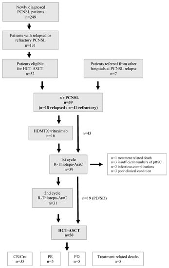 Flow chart of treatments and responses of patients with r/r PCSNL. Abbreviations: CR/Cru—complete remission/complete remission unconfirmed, HCT-ASCT—high dose chemotherapy with autologous stem cell transplantation, HDMTX—high dose methotrexate, r/r—relapsed/refractory, PCNSL—primary CNS lymphoma, pBSC—peripheral blood stem cells, R-Thiotepa-AraC—rituximab, thiotepa, cytarabine.