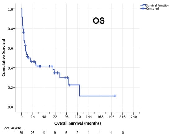 In this retrospective study, we analyzed long-term outcome, prognostic factors, and toxicity of HCT-ASCT in a cohort of 59 patients with r/r PCNSL. Treatment options in the situation of r/r PCNSL are WBRT [,], HD-MTX rechallenge in case of late relapse [,], topotecan [,], temozolomide (+ rituximab) [,] or ifosfamide and etoposide in combination with cytarabine [] or rituximab []. In addition, an increasing number of novel therapeutic agents and cellular immunotherapies is evaluated within clinical studies [,].