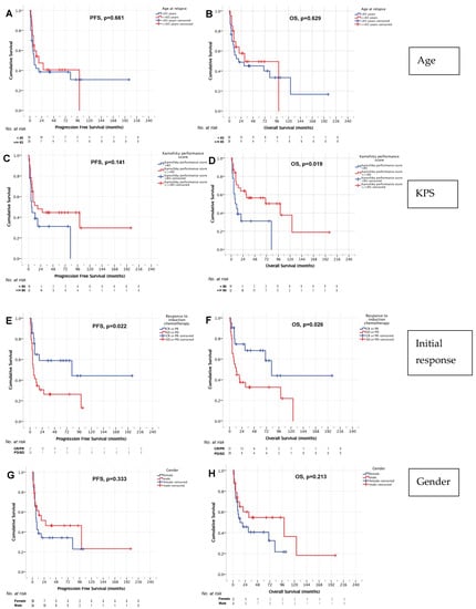 No significant difference in survival associated with gender was demonstrated in univariate analysis. Median PFS was 27 months (95% CI 0–82 months) in male patients and 8 months (95% CI 5–11 months, p = 0.333, Figure 4G) in female patients. Median OS was 100 months (95% CI 0–209 months) and 14 months (95% CI 0–36 months, p = 0.213, Figure 4H), respectively.