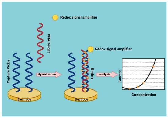 Moreover, electrochemical sensors could have a strategic role in the clinical use of this analysis, so-called liquid biopsy. For example, evaluating circulating free DNA (cfDNA) transported by blood might be an attractive option to traditional bone marrow biopsy for assessing neoplastic load and offering a complete report of the temporal and spatial heterogeneousness of the tumor genetic landscape []. Concerning other cancer biomarkers, cfDNA has several advantages, such as high specificity and little invasiveness []. However, the currently available identification methods, such as PCR and DNA sequencing, require difficult, expensive, and long procedures, which limit their clinical application. Electrochemical biosensors are sensitive, specific, and more accessible and are quicker methods of identifying cfDNA []. Furthermore, selecting bioreceptors using intensification methods with nanoparticles and multi-tags components might augment the efficacy of electrochemical biosensors.