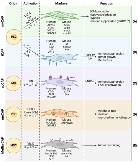 Cancer-associated fibroblast (CAF) heterogeneity in PDAC, with focus on cell of origin, activator signals, species-dependent markers, and functions. (A) Myofibroblastic CAFs with high alpha-SMA expression. (B) Inflammatory CAFs showing abundant IL1 receptors. (C) Antigen-presenting CAFs that express MHC-II. (D) Metabolic CAFs bearing increased glycolysis. (E) Meflin+ CAFs with tumor-restraining properties.