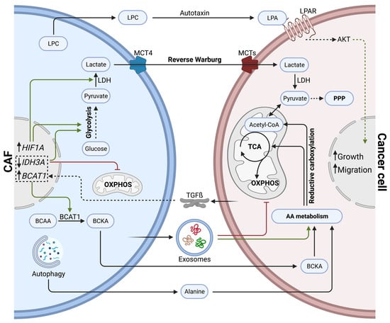 Other than through exosomes, CAFs can stimulate branched-chain amino acid (BCAA) metabolism in cancer cells by upregulating branched-chain alpha-ketoacid (BCKA) production. CAFs secrete BCKA, which is taken up by cancer cells and further oxidized to fuel the TCA cycle. Intriguingly, cancer cell-derived TGFß stimulates BCKA synthesis in CAFs by inducing ECM internalization and BCAT1 expression. BCAT1 is a known catalyzer of BCAAs transamination into BCKA [].