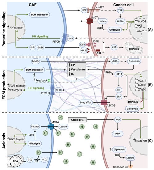 Interestingly, KRAS mutant cancer cells hijack CAFs to enhance oncogenic KRAS signaling and adapt their own metabolism in a reciprocal manner. KRAS mutations in tumor cells increases the pool of cytokines secreted (GM-CSF, G-CSF, SHH), and, therefore, are exposed to CAFs in the TME. Canonical HH signaling in CAFs upregulates ECM production, as well as the secretion of IGF1 and GAS6. IGF1 and GAS6 can then reciprocally affect tumor cells, via the IGF1R/AXL-AKT axis. Since KRAS mutations can lead to impaired mitochondrial respiration [], this sophisticated reciprocal signaling node restores mitochondrial respiration in KRAS mutant tumor cells via SHH, IGF1R/AXL, and AKT [].